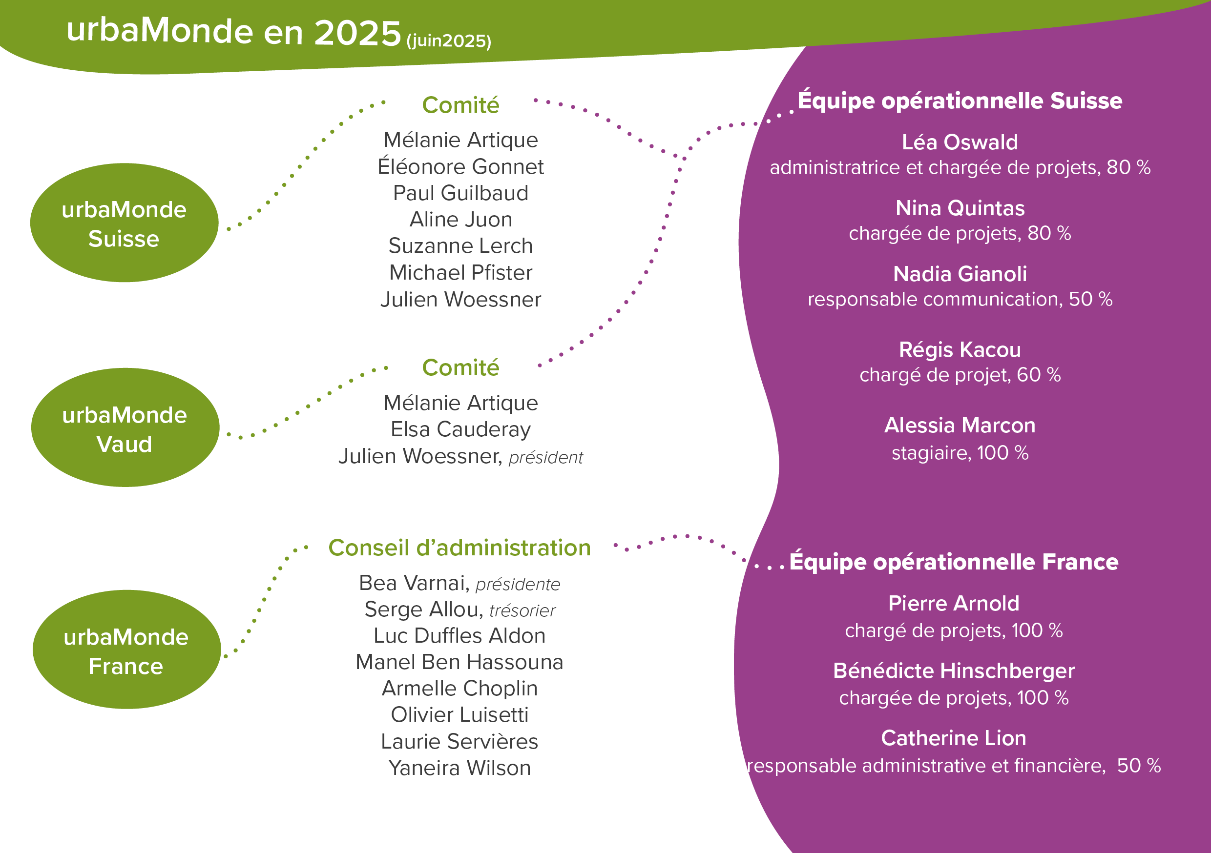 Click here to consult the organisational charts of urbaMonde-Suisse, urbaMonde-France and urbaMonde-Vaud.